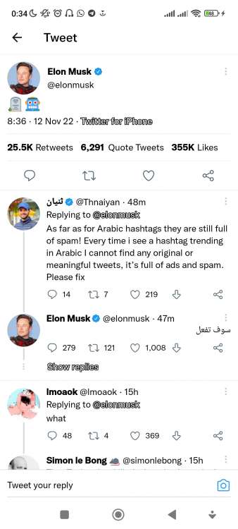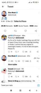 المستخدم الذي ينتمي الى المنطقة العربية وجه لماسك مطلبا بخصوص الرسائل “غير المرغوب” فيها التي توجد داخل الوسوم العربية، حيث طالبه بإصلاحها ورد بعدها رجل الأعمال إيلون ماسك باللغة العربية “سوف تفعل”.