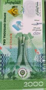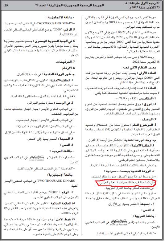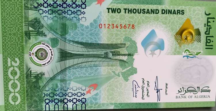 فبحسب النظام رقم 02-22 المؤرخ في 18 أكتوبر 2022، الصادر في الجريدة الرسمية للجمهورية الجزائرية بتاريخ 23 أكتوبر المنصرم العدد 70 الصفحة 39، المتضمن إنشاء ورقة نقدية تذكارية من فئة 2000 دينار جزائري، فقد اشتمل وجه الورقة النقدية على موضوع “التحرير والاستقلال”، متضمنا أنماطا زخرفية ورسما مقتبسا من صورة للاحتفال بالاستقلال وصورة للأمير عبد القادر، وأيضا شعار قمة جامعة الدول العربية وخريطة العالم العربي.